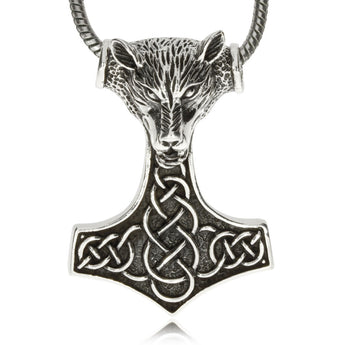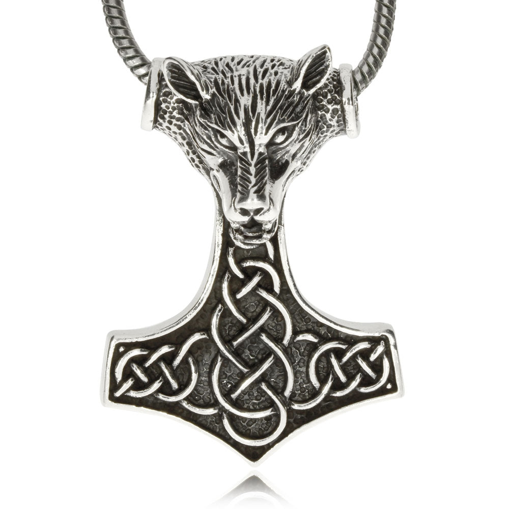 Stříbrný přívěsek s oblíbeným motivem Thorova kladiva s vlčí hlavou je patinován a tak pěkně vyniká reliéf vzoru. Mohutný šperk je vhodný především pro muže, může však vyhovovat i ženám se zálibou v keltské tématice. Návlek na přívěsek musí být dostatečně silný, aby se nepoškodil jeho značnou hmotností - 14 gramů.