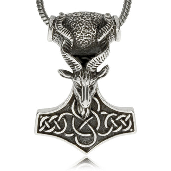 Mohutný přívěsek ze stříbra 925/1000, které je povrchově patinované, má tvar Thorova kladiva. Tento oblíbený amulet je ozdoben hlavou kozla se šroubovitými rohy. Ačkoliv bychom se mohli domnívat, že se jedná o mystické zvíře z předpeklí, není tomu tak. Takový tvor obývá dosud lesy západní Himaláje. Pro zajímavost stojí za zmínku, že rohy skutečného kozla mohou dosahovat až 160 cm délky. Tento stříbrný přívěsek je mohutnější a těžší, je proto třeba na jeho zavěšení využít silnější řetízek nebo kožený řemínek.