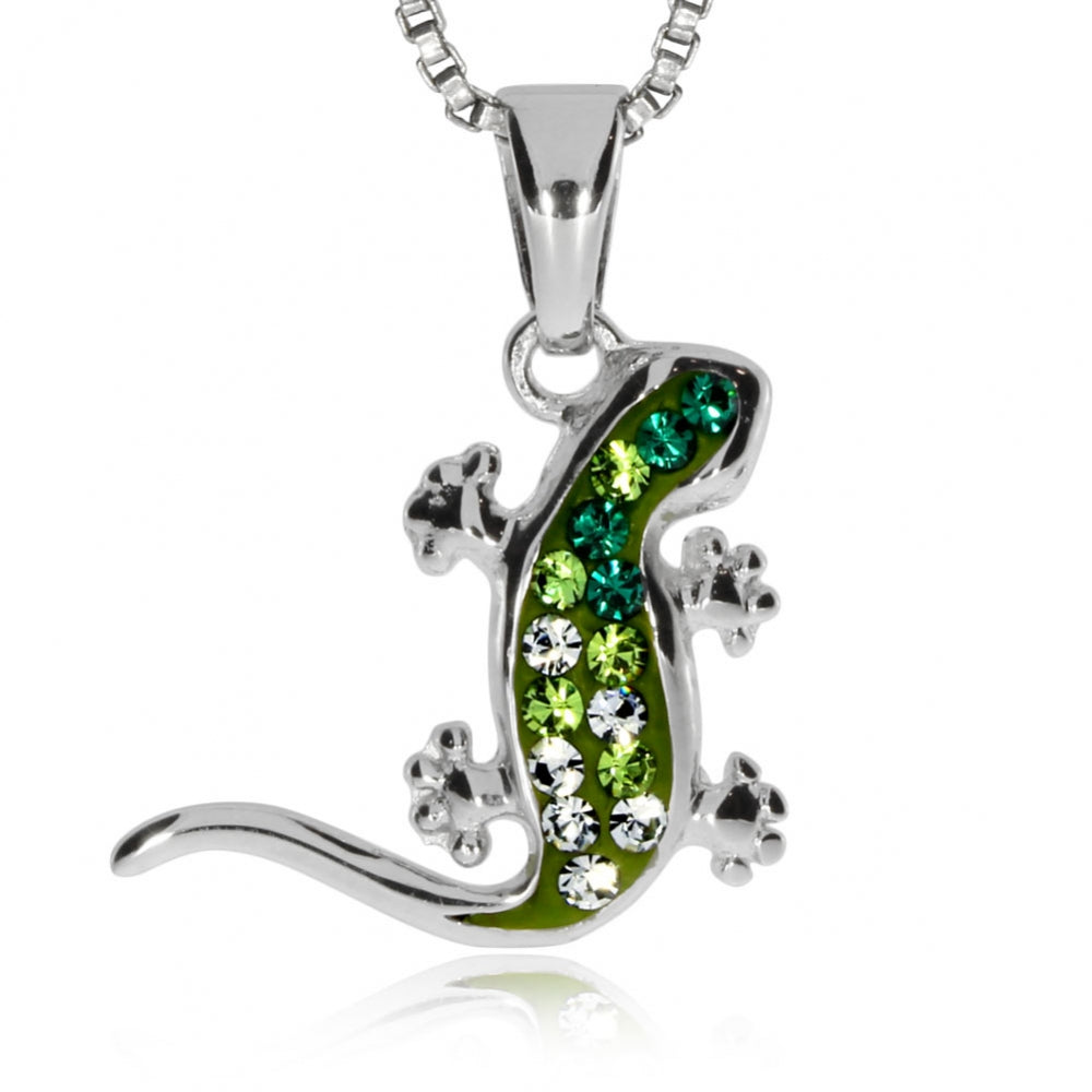 Maličký přívěsek ze stříbra ve tvaru ještěrky se zelenými broušenými krystaly Swarovski. Ačkoliv je šperk velmi malý, svou barvou i tvarem je nepřehlédnutelný. Jistě může jako dárek přinést velkou radost.