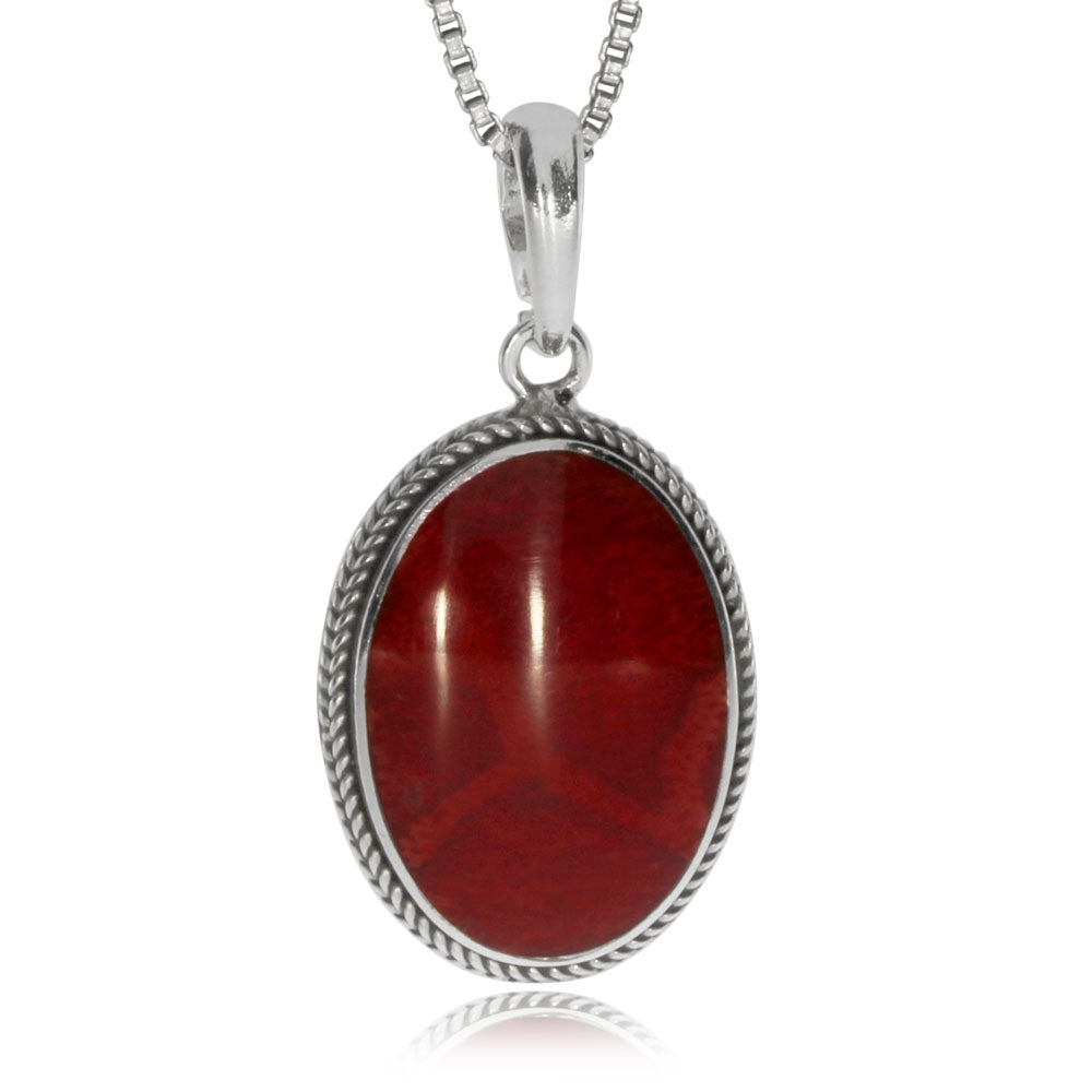 Klasický oválný přívěsek je ozdoben kabošonem z houbového korálu, který je zasazen do jemně vroubkované obruby. Přívěsek má delší leštěné očko, kterým projde i silnější řetízek. Zajímavá barva korálu se velmi pěkně vyjímá na pokožce nebo světlém oblečení.