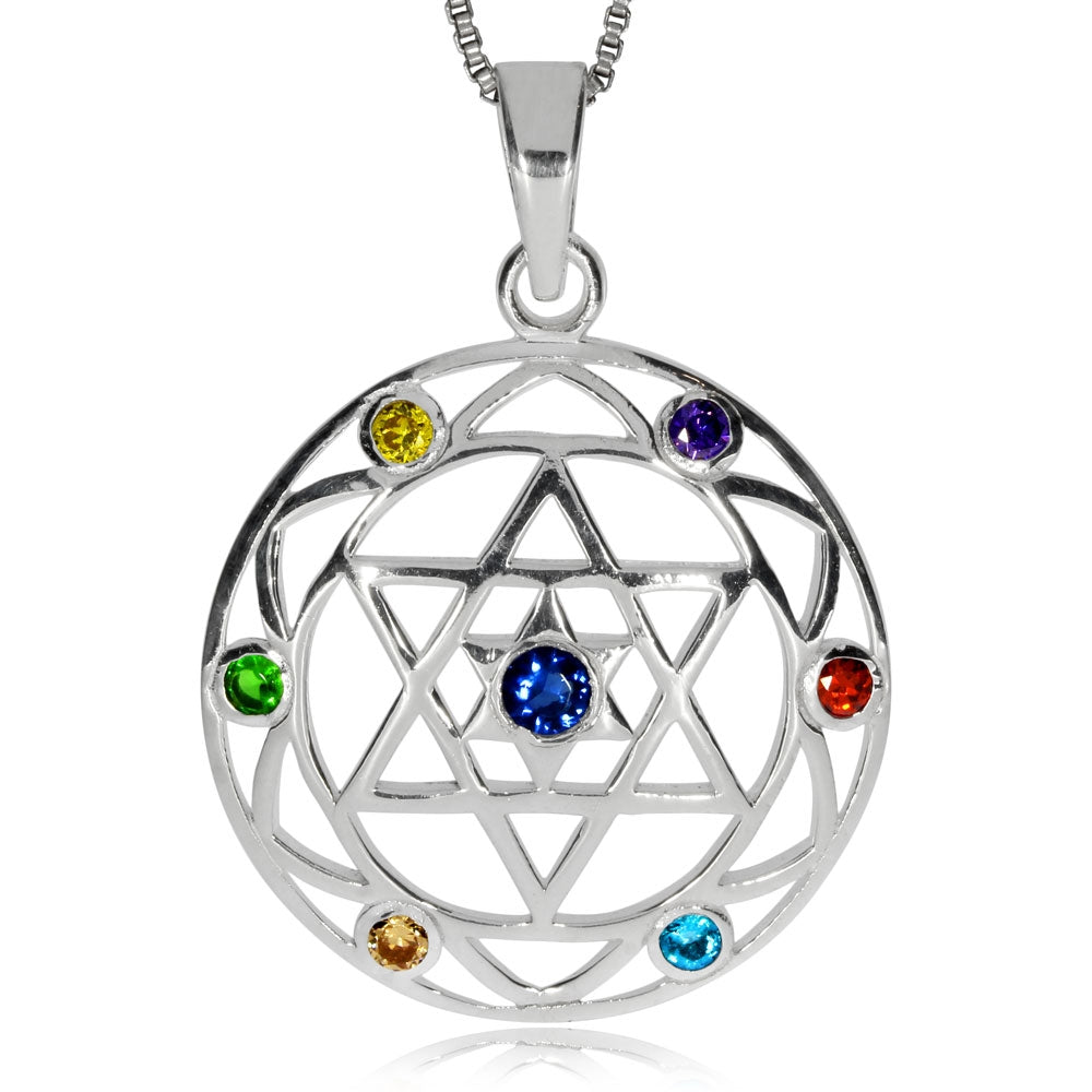 Větší stříbrný přívěsek zaujme motivem šesticípé hvězdy uvnitř zdvojené kružnice, která Davidovu hvězdu lemuje. Celkově velmi vzdušný přívěsek je zpestřen sedmi různě barevnými broušesnými sklíčky a působí tak velmi dekorativně. Přívěsek má větší leštěný úchyt, kterým je možné provléknout i silnější řetízek.