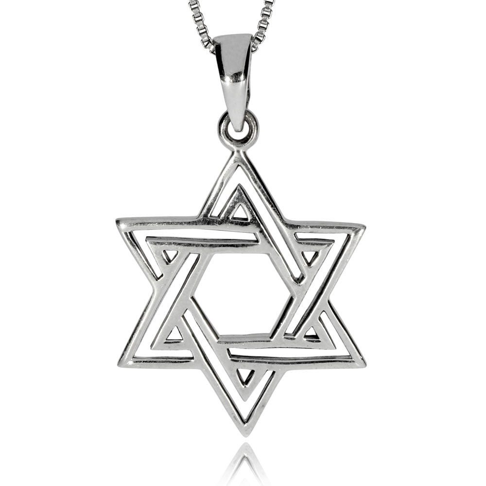Stříbrný přívěsek v podobě Davidovy hvězdy vyniká zdvojenou linií, díky které je velmi dobře patrné propletení cípů hvězdy. Přívěsek je vysoký téměř 4 cm a má jednoduchý leštěný úchyt na provlečení řetízku.