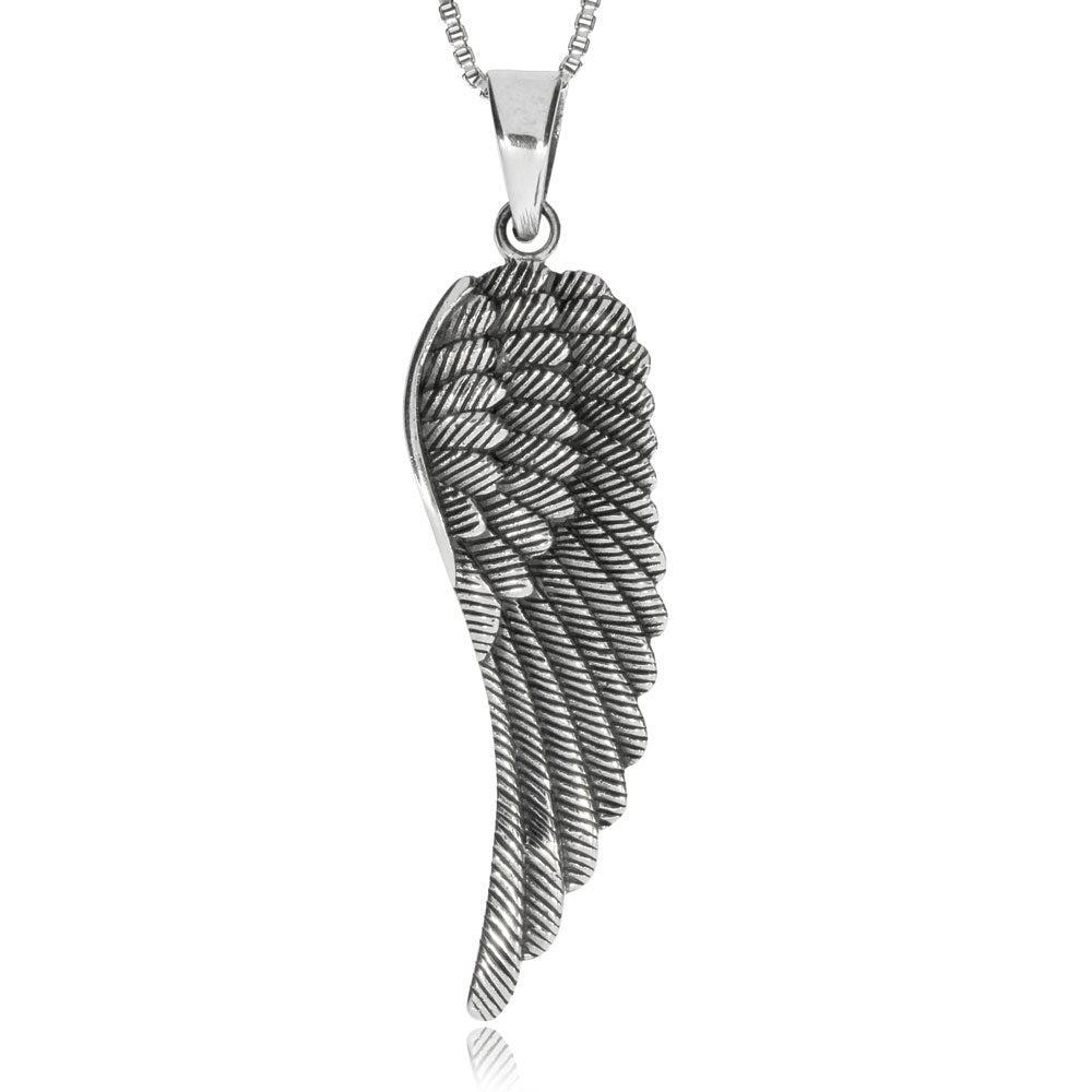 Poetický stříbrný přívěsek, jehož darováním ženě nebo muži můžete vyvolat romantickou náladu. Detailně propracovaná peruť, andělské křídlo je vyrobeno ze stříbra o ryzosti 925/1000, které je na povrchu pokryto starostříbrnou patinou. Délka přívěsku i s větším očkem je téměř 5 cm.