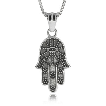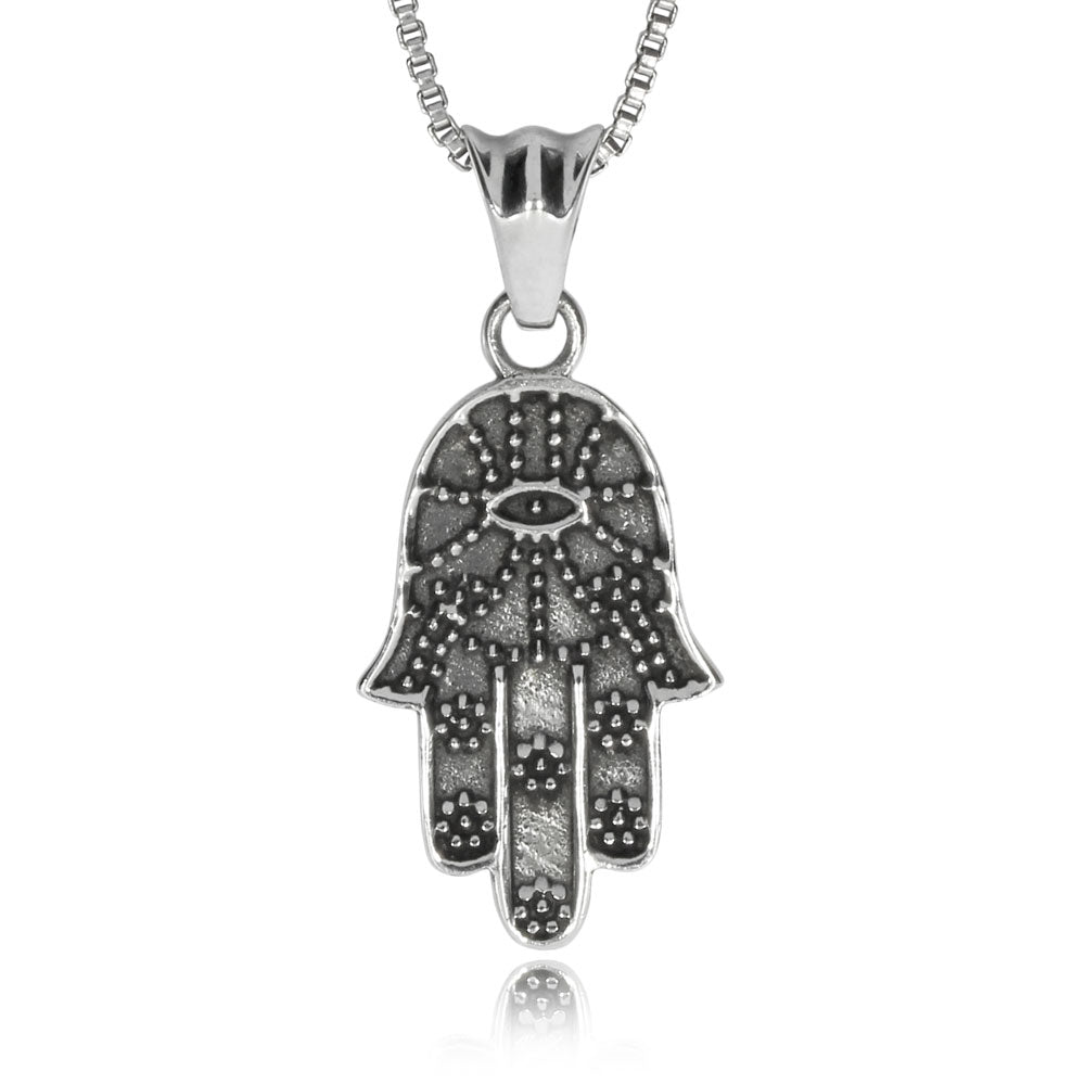 Drobnější stříbrný přívěsek je vyroben ze stříbra o ryzosti 925/1000 a je na povrchu patinován. Velmi starý ochranný symbol je oblíbený i v současnosti. Někdy je označován jako Hamsa.