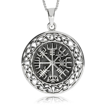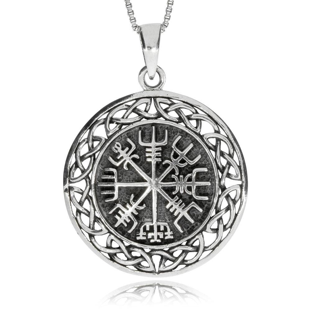 Kultatý přívěsek s prastarým vikingským symbolem je vyroben ze stříbra o ryzosti 925/1000, které je na povrchu upraveno starostříbrnou patinou. Vikingský kompas Vegvisir tak daleko lépe vvyniká na tmavém podkladu. Obvod přívěsku je ozdoben spletenými nekonečnými uzly. Přívěsek vhodný pro muže a ženy, kteří mají rádi masívnější šperky. Přívěsek je poměrně těžký a je proto nutné ho zavěsit na silnější řetízek nebo kaučukový návlek.