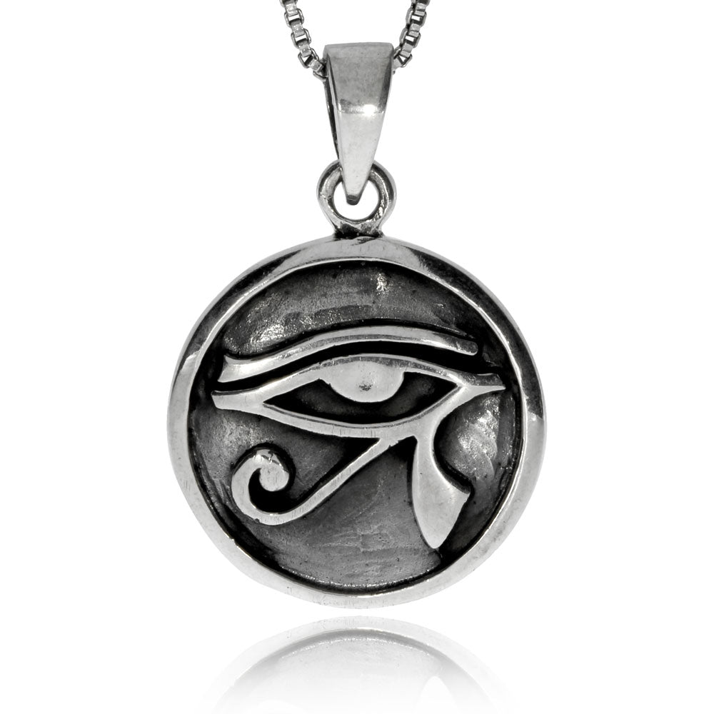 Kruhový přívěsek nese staroegyptský motiv Horova oka. Bůh Horus použil své oko k oživení Osirise a proto symbolizuje věčný život a znovuzrození. Až do dnešních dob se používá jako talisman, který přináší sílu a moc, hodí se tedy i jako pěkný dárek. Starostříbrná úprava potom umocňuje jeho starodávný vzhled.