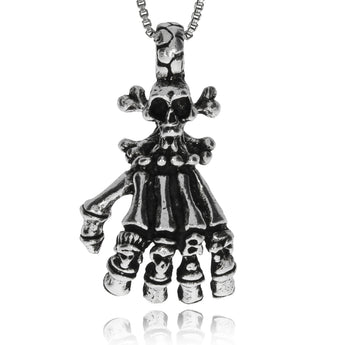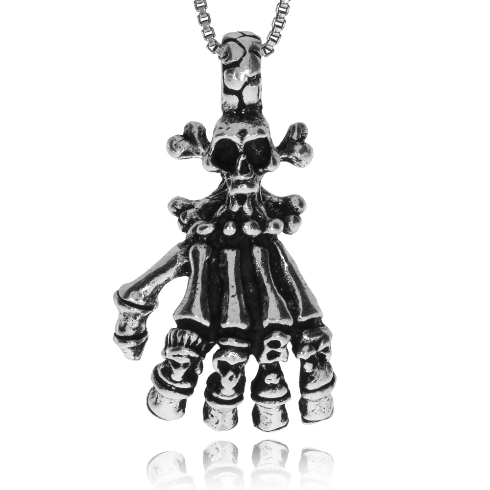 Zajímavě zpracovaný přívěsek, který se hodí pro muže i ženy, je ozdobou s nápaditým a hrůzostrašným motivem. Na kostlivcově ruce spočívá lebka se zkříženými hnáty. Vzhledem ke starostříbrné úpravě povrchu jsou všechny detaily pěkně výrazné.