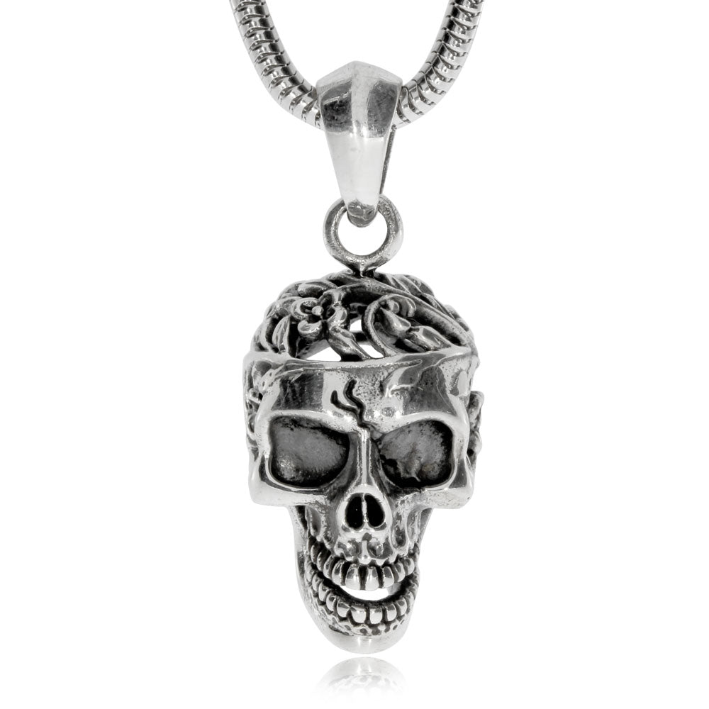 Lebky patří k velice oblíbeným motivům posledních let. Tento originální přívěsek potěší každého, kdo se v tomto trendu shlédl. Je vyrobený ze stříbra se starostříbrnou úpravou povrchu, výborně jsou tak znát jednotlivé části propracovaného motivu. Horní část lebky je doplněná květinovým motivem, který skvěle kontrastuje s hrůzostrašným symbolem, a vzniká tak pozoruhodný a neotřelý šperk. Lebka váží přes 9 gramů a včetně ouška má na výšku 3,90 centimetrů.