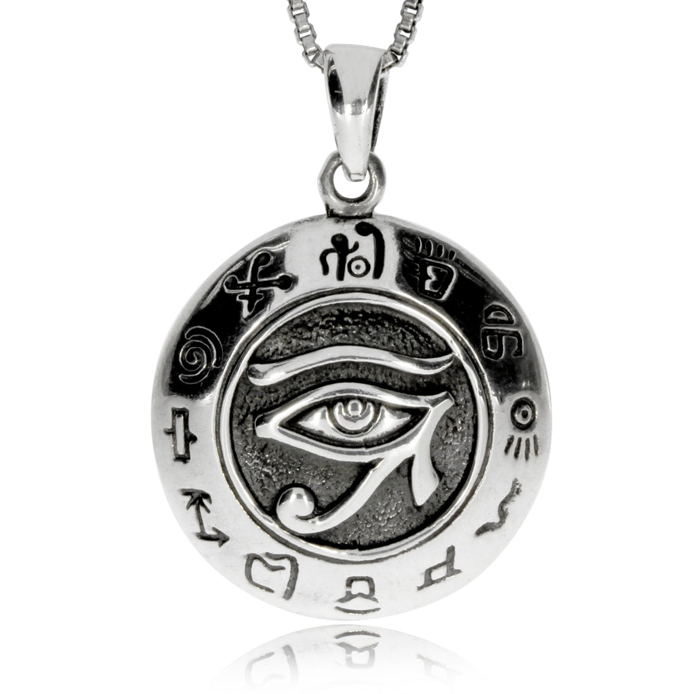 Originálně zpracovaný kruhový přívěsek, který potěší všechny znalce a obdivovatele egyptské kultury a starobylých symbolů. Ve středu přívěsku je vyobrazené Horovo oko, oblíbený hieroglyf, který se také používal jako ochranný amulet. Podle legendy s ním bůh Horus oživil svého otce, je proto symbolem věčnosti. Obvod kruhu zdobí menší egyptské symboly. Přívěsek je vyrobený ze stříbra se starostříbrnou úpravou, prvky motivu tak skvěle vynikají, a přívěsek působí jako z dávných dob.
