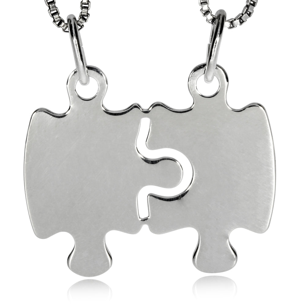 Velice oblíbený a důmyslný přívěsek přestavuje dva spojené dílky puzzle, které se po rozlomení stanou samostatnými přívěsky. Druhou polovinou svého přívěsku tak můžete obdarovat někoho blízkého a vyjádřit tak mimořádné spojení, které mezi vámi je. Rhodiovaná úprava povrchu zanechává stříbro krásně hladké a lesklé.