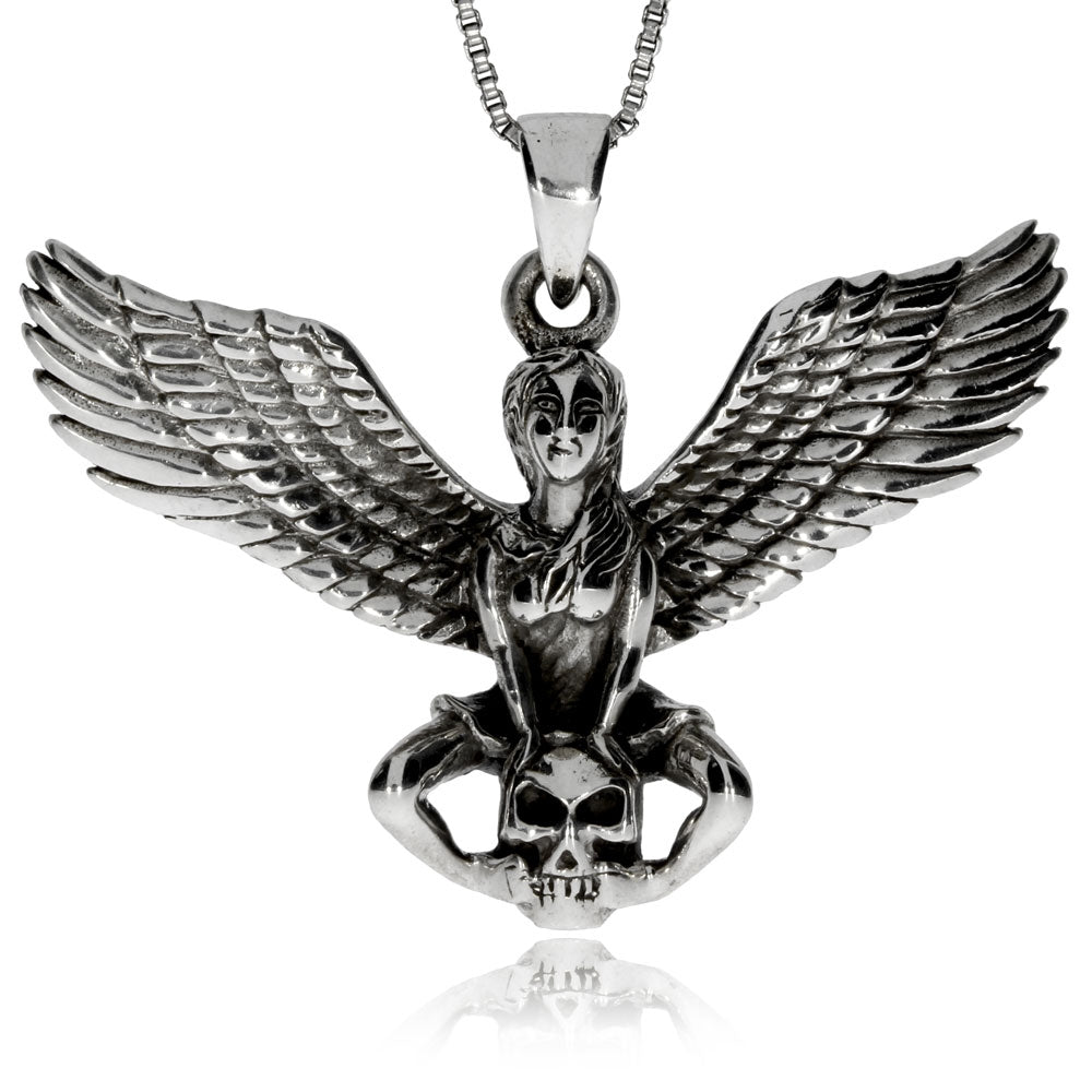 Originální přívěsek se skutečně netradičním motivem, který rozhodně upoutá pozornost. Přívěsek znázorňuje ženu a obrovskými perutěmi, která sedí na lidské lebce. Šperk potom doplňuje starostříbrná povrchová úprava.
