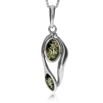 Nápaditý dámský přívěsek, který upoutá pozornost svou jednoduchostí a netradiční souhrou materiálů. Starostříbrnou linii zdobí dva oválné jantary různé barvy, přívěsek tak skvěle vynikne především s dalšími jantarovými šperky.
