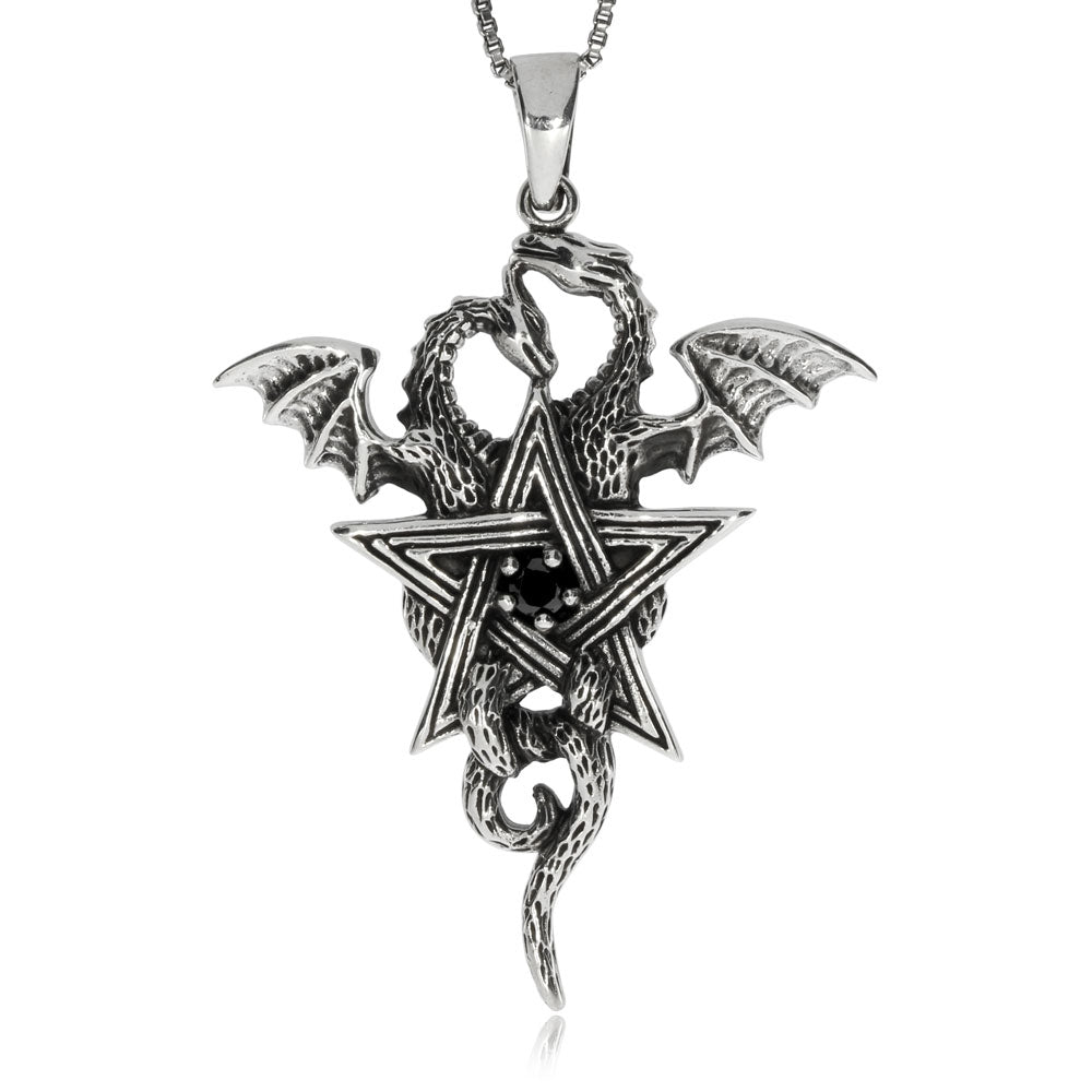 Stříbrný přívěsek kombinuje v esteticky vyváženém stylu dva silné motivy - pentagram a okřídlené draky. Pentagram patří k nejuctívanějším magickým symbolům v mnoha kulturách. Propletení draci společně s pentagramem bývají označováni jako dračí hvězda a jsou amuletem pro vyrovnanost.