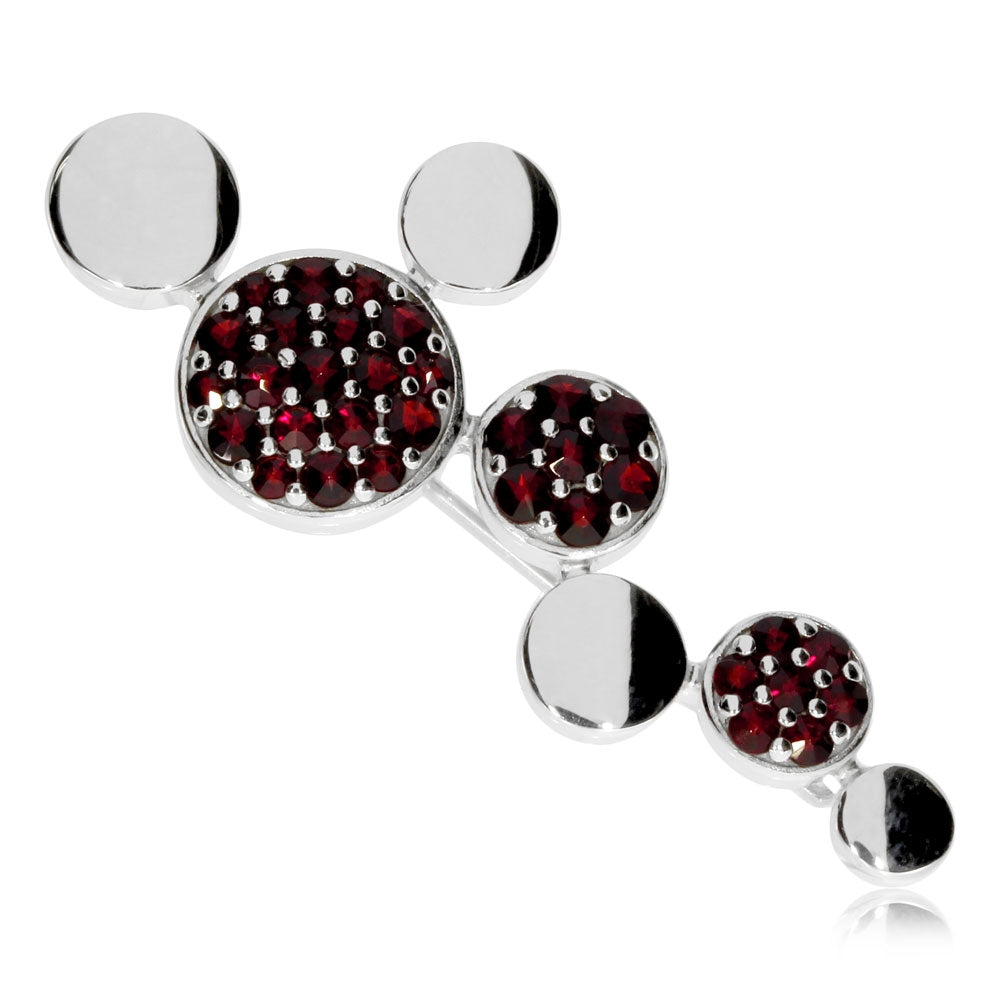 Moderní stříbrná brož s českými granáty byla vyrobena v Granátu Turnov. Kombinace lesklých rhodiovaných plošek a koleček posázených granáty broušených typickým hvězdovým brusem vytváří velmi přitažlivý kontrast. Téměř 5 cm dlouhá brož se bude díky tomuto kontrastu velmi dobře vyjímat na tmavém i světlém oděvu.