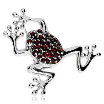 Stříbrná rhodiovaná brož v podobě žabky má tělo poseté českými granáty a granáty almandiny. Kameny jsou vybroušené hvězdovým brusem, který je typický pro český granátový šperk. Brož je výrobkem klenotníků z družstva Granát Turnov. Obdržíte ji v krabičce Granátu Turnov a s certifikátem výrobce.