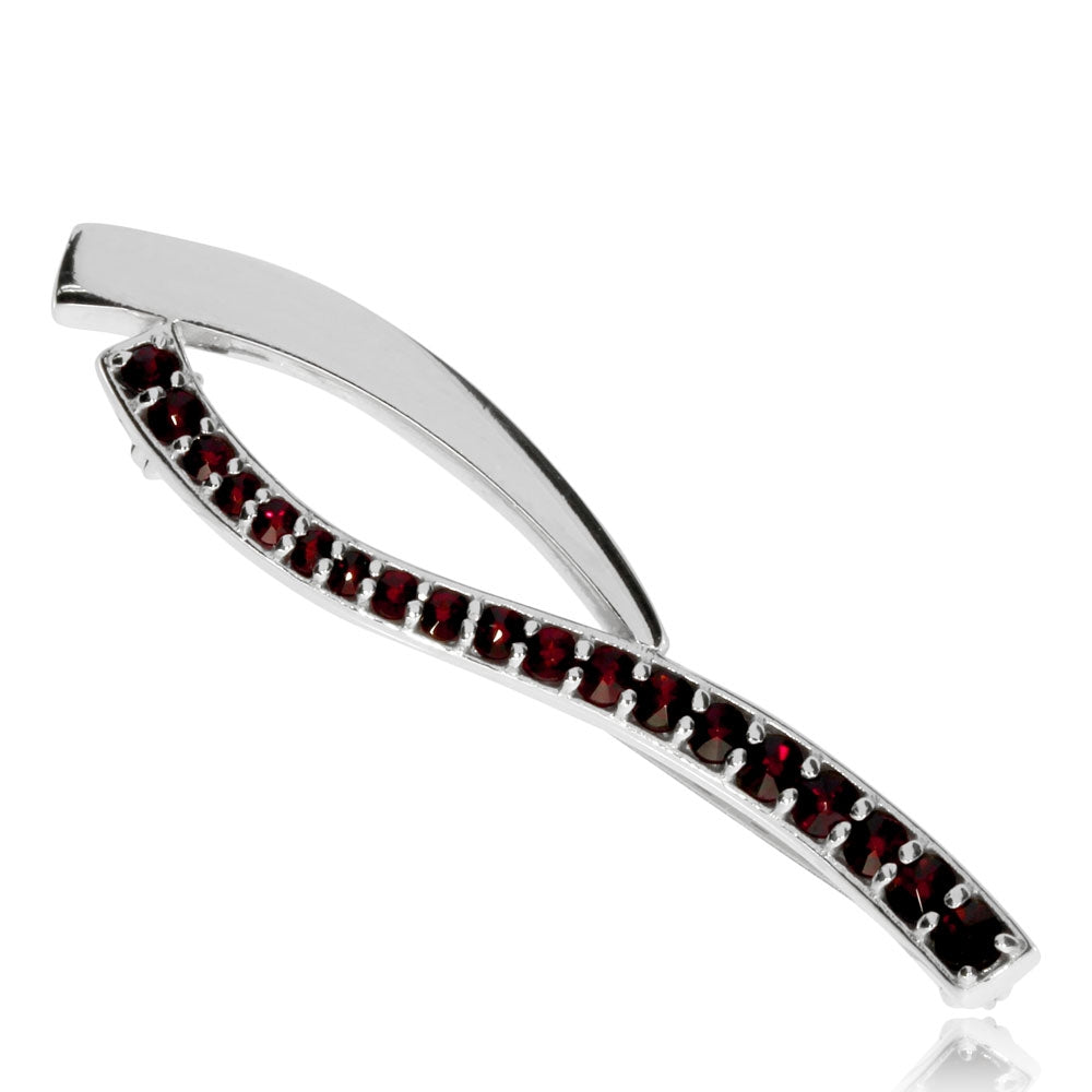 Ladné křivky esovitě zvlněné brože sází na kontrast leskle hladkého rhodiovaného stříbra a granáty hustě osazené delší linie. Moderní šperk byl vyroben v Granátu Turnov a je osazen jak českými granáty, tak většími granáty - almandiny. Granáty jsou vybroušené hvězdovým brusem, který je typický pro české granáty.