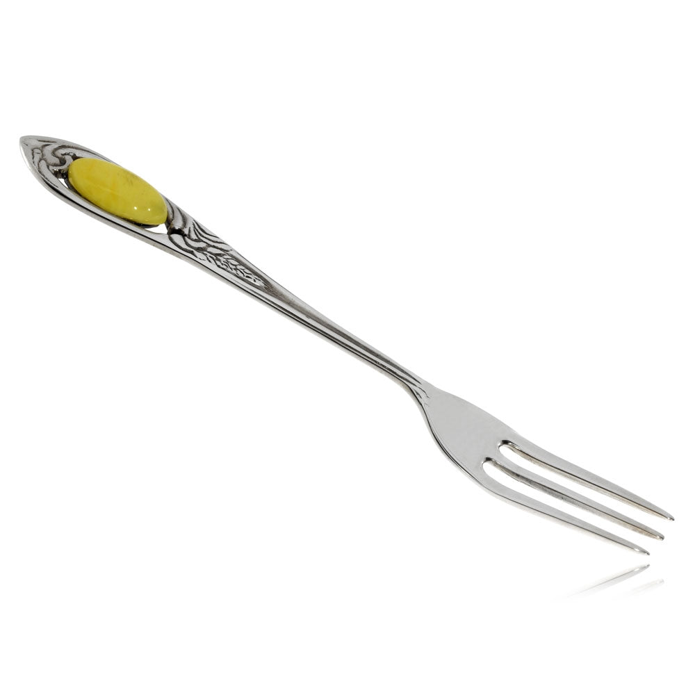 Vidlička ze stříbra ozdobená světle žlutým jantarem