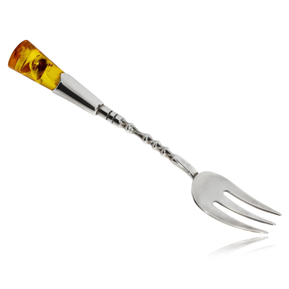 Ozdobná dezertní vidlička ze stříbra 925/1000 je dekorována větším kouskem přírodního baltského jantaru. Pokud bude vidlička používaná, je třeba ji omývat s velkou opatrností a vědomím, že jantar je velmi choulostivý na vysoké teploty a jakékoliv chemické látky.