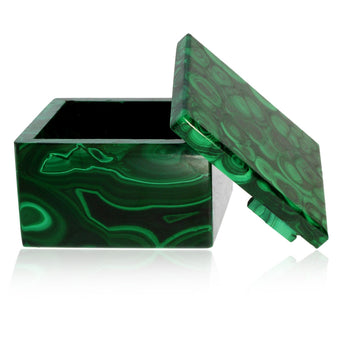 Malá čtvercová krabička z přírodního malachitu má nádhernou kresbu kamene.