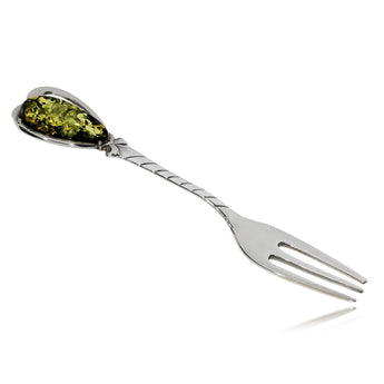 Stříbrná vidlička ozdobená jantarem nazelenalé barvy