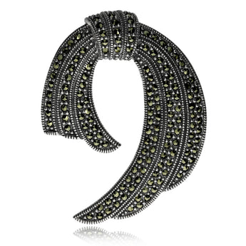 Nádherná brož plná skvostného lesku skvěle ozdobí každé elegantní oblečení a bude vždy působit vybraně. Krásně jednoduché zpracování je doplněné drobnými markazity, polodrahokamy s výrazným kovovým třpytem. Ten je umocněný starostříbrnou úpravou povrchu, která vytváří starobylý dojem.