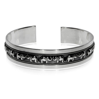 Velice pěkně zpracovaný dámský náramek pevného typu, který je vyrobený ze stříbra se starostříbrnou povrchovou úpravou. Ta mu dodává jedinečný starobylý půvab a dává dobře vyniknout obvodovému vzoru. Jeho ústředním motivem jsou sloni, ti jsou ostatně oblíbeným námětem. Snad proto, že odjakživa představují moudrost a sílu.
