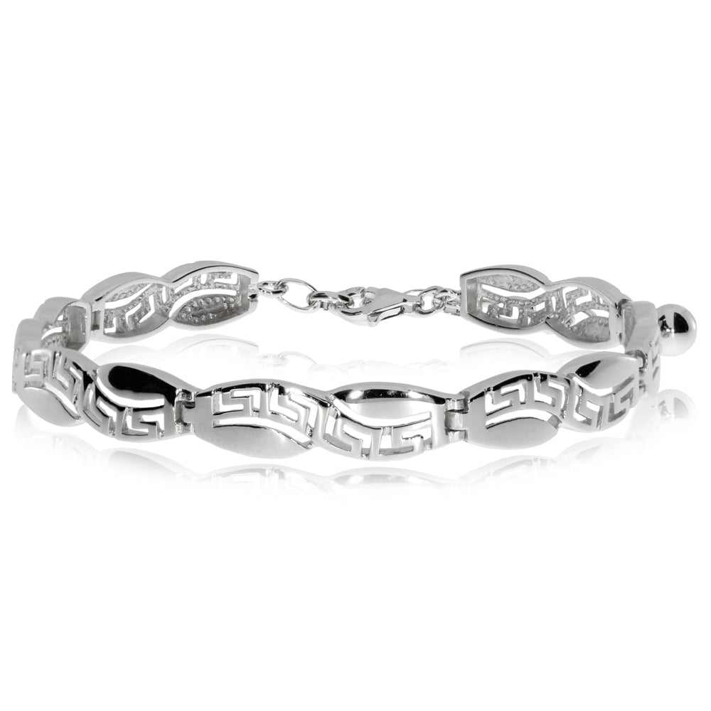 Stříbrný rhodiovaný náramek je tvořen z oválných článků, které v sobě nesou motiv řeckého meandru. Šperk má díky rhodiu vysoký lesk a nebude podléhat oxidaci. Náramek je vybaven prodlužovacím řetízkem, který je rovněž rhodiovaný a je zakončen ozdobnou kuličkou. Základní délka 18 cm je řetízkem prodloužena o cca 3 cm.