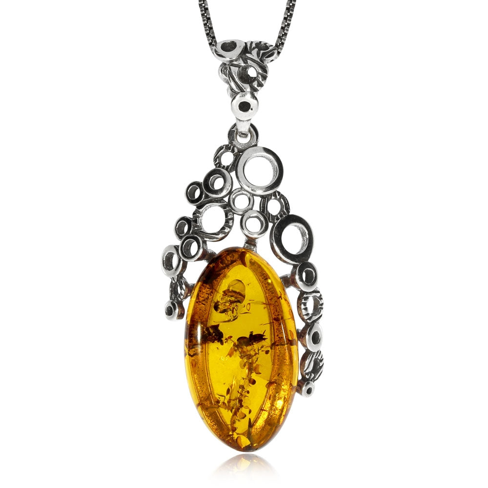 Stříbrný přívěsek - Jantarový ovál zdobený kroužky
