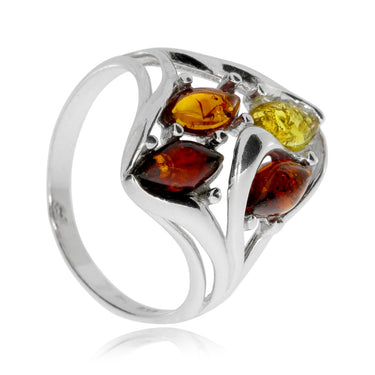 Stříbrný prsten zdobený jantary - Kulaté a oválné kameny umístěny v protilehlých rozích 727 Kč /Tax included.