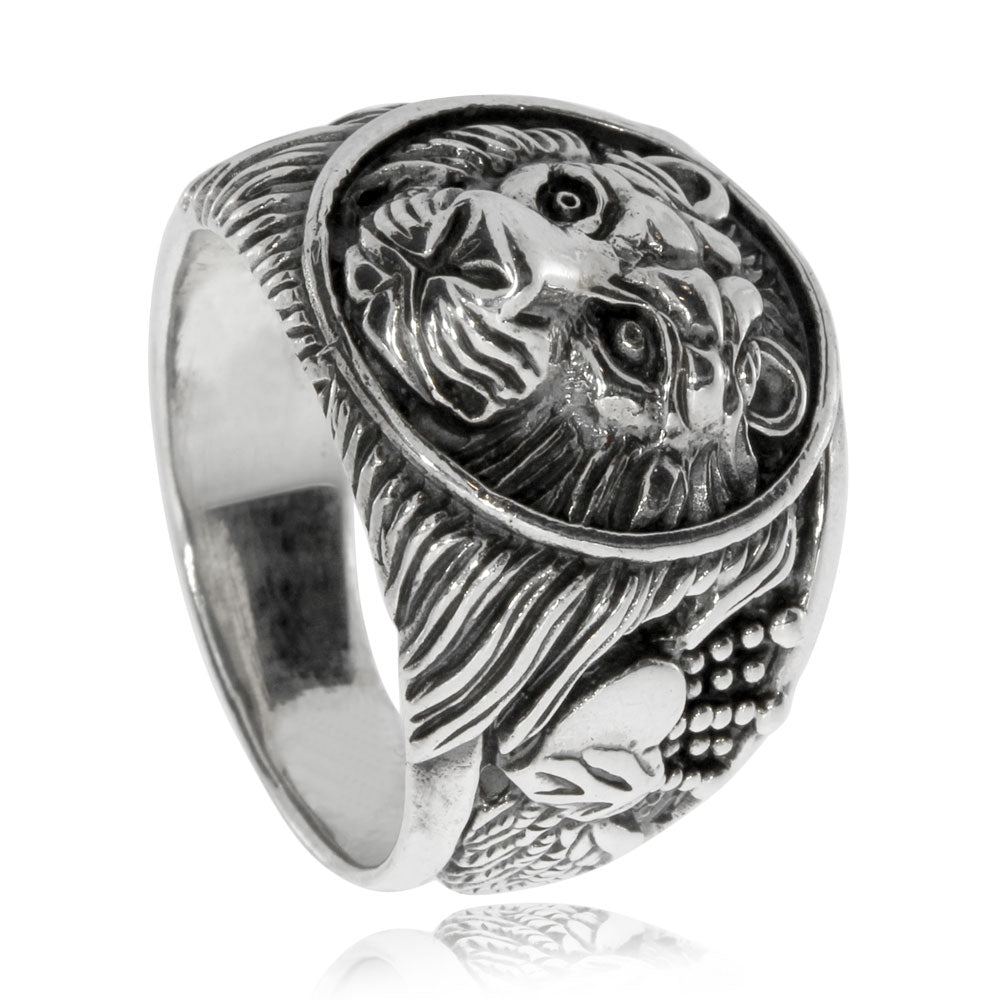 Širší stříbrný prsten je ozdoben lví hlavou. Starostříbrná patina plastického reliefu zdůraňuje detaily šperku. Prsten je poměrně těžký - jeho hmotnost přesahuje 11 gramů. Je vhodný pro muže a ženy, které dávají přednost robusnějším šperkům s výraznou symbolikou.