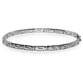 Řecký vzor je velice oblíbený pro svou originalitu, jednoduchou geometrickou zajímavost a decentní ráz. Šperky, které zdobí, působí jemně a zároveň nápaditě. Tento dámský náramek je složený s jednotlivých dílků, které vyobrazují právě tento motiv. Šperk je vyrobený ze stříbra s rhodiovaným povrchem, který vyniká svou odolností a také leskem. V naší nabídce najdete k tomuto náramku také náušnice a náhrdelník se stejným vzorem.
