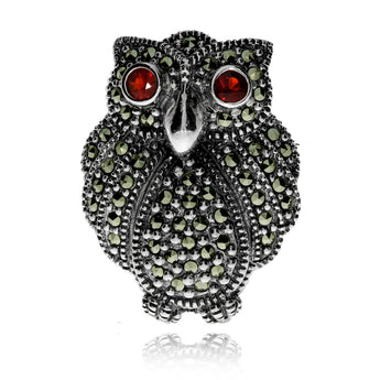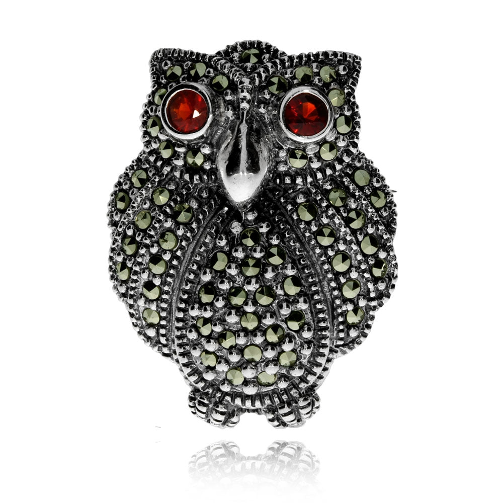 Stříbrná brož zdobená markazitem a granáty ve tvaru malé sovičky zaujme na první pohled. Brož je drobná a může být proto ozdobou i malé klopy nebo límečku.
