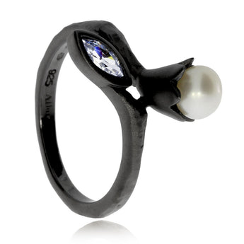 Originálně zpracovaný dámský prsten z kolekce luxusních šperků Allure zaujme svým neotřelým designem a pozoruhodnou souhrou kontrastních materiálů. Prsten je vyrobený ze stříbra potaženého vrstvou vzácného ruthenia, to barví povrch prstenu dotmava. Tento efekt umocňuje osazení třpytivým čirým zirkonem (cubic zirconia) a bělostnou říční perlou. Působivě něžný šperk potěší ženy a dívky s láskou ke všemu výjimečnému.