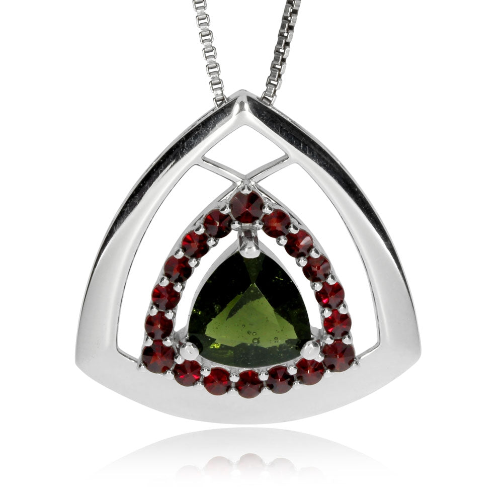 Elegantní tvar zaobleného trojúhelníku dává vyniknout kráse dvoui hlavních českých polodrahokamů - zelenému vltavínu a českému granátu s jeho temně rudou barvou. Zajímavé uchycení přívěsku na řetízek je součástí moderního designu. Unikátní šperk je z mistrovských dílen družstva umělecké výroby Granát Turnov a při jeho zakoupení obdržíte certifikát pravosti od výrobce.