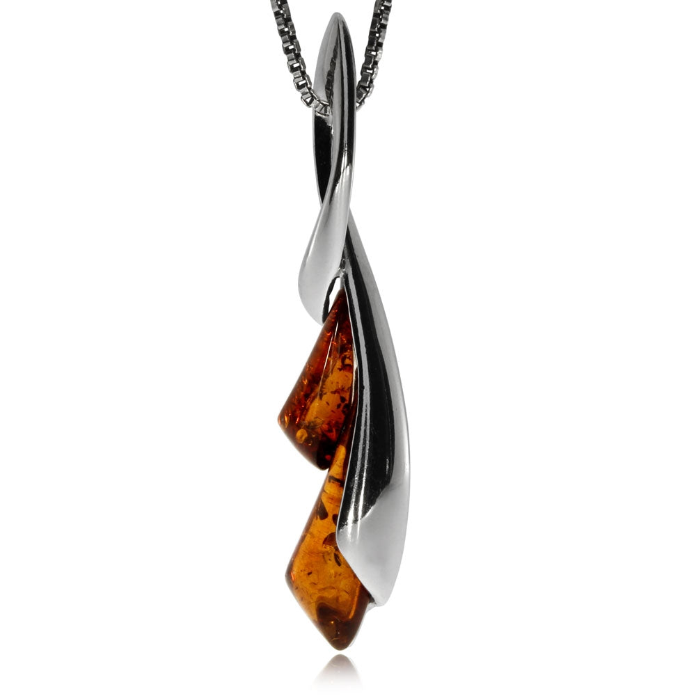 Jemný a velice elegantní dámský přívěsek, který zaujme svým jednoduchým půvabem. Přívěsek je vyrobený ze zářivého rhodiovaného stříbra a nese dva kousky zlatavého jantaru. Skvěle potom vynikne zejména s dalšími jantarovými šperky.