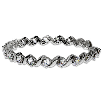 Krásně třpytivý a velice elegantní dámský náramek, který bude dobrou volbou i pro slavnostní příležitosti a večerní nošení. Náramek zdobí osázení třpytivými syntetickými zirkony (cubic zirconia), jejichž záře skvěle vyniká v lesklém povrchu rhodiovaného stříbra.
