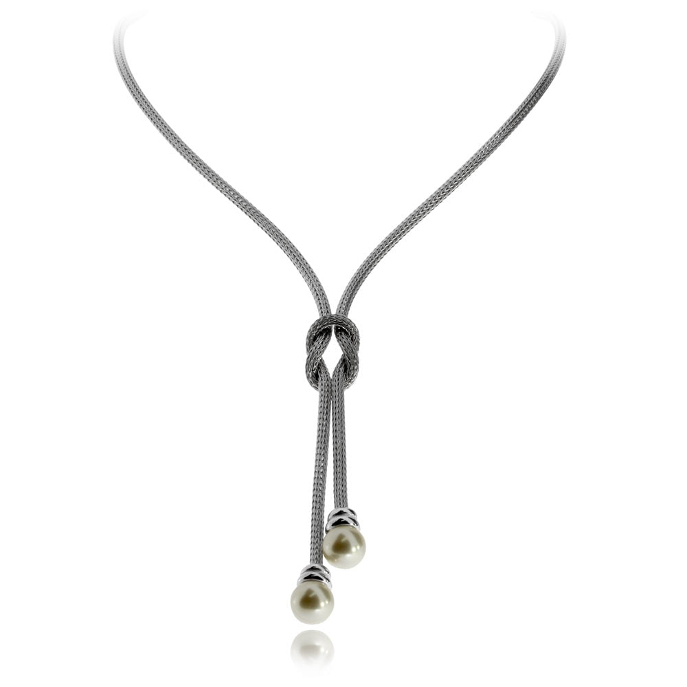 Nádherný dámský šperk, který se skvěle hodí ke každému elegantnímu oblečení i pro každodenní nošení. Náhrdelník tvoří kulatá pletenina ze stříbrných nití, která ve středu vytváří jednoduchý ozdobný uzel, z toho se potom spouští dále a zakončují ji dvě bílé syntetické perly. Náhrdelník je vyrobený ze zářivého a lesklého rhodiovaného stříbra, které s perlami vytváří okouzlující souhru.