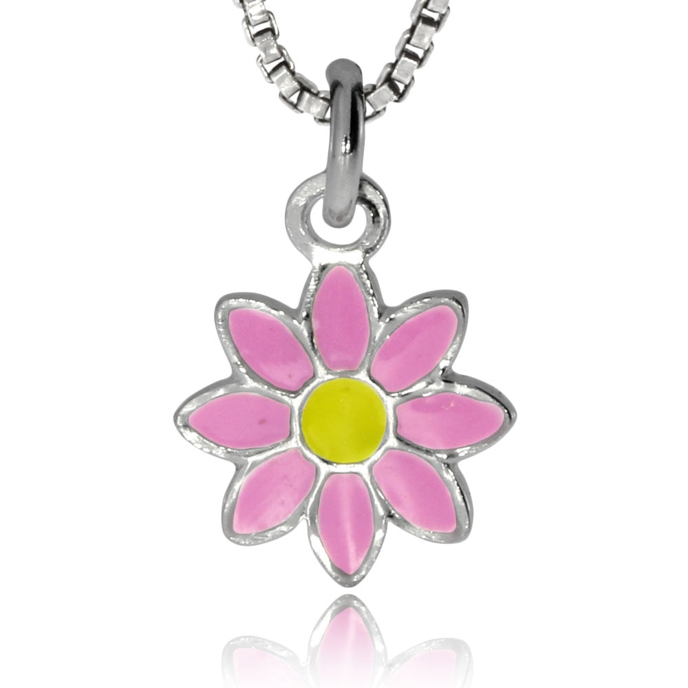 Dětský stříbrný přívěsek ve tvaru kvítku je barevně dekorován růžovou a žlutou barvou. Pro malé parádnice je to skvělý doplněk k náušničkám se stejným motivem
